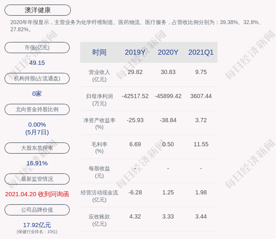 2020年年報顯示,澳洋健康的主營業(yè)務為化學纖維制造、醫(yī)藥物流、醫(yī)療服務,占營收比例分別為:39.38%、32.8%、27.82%。