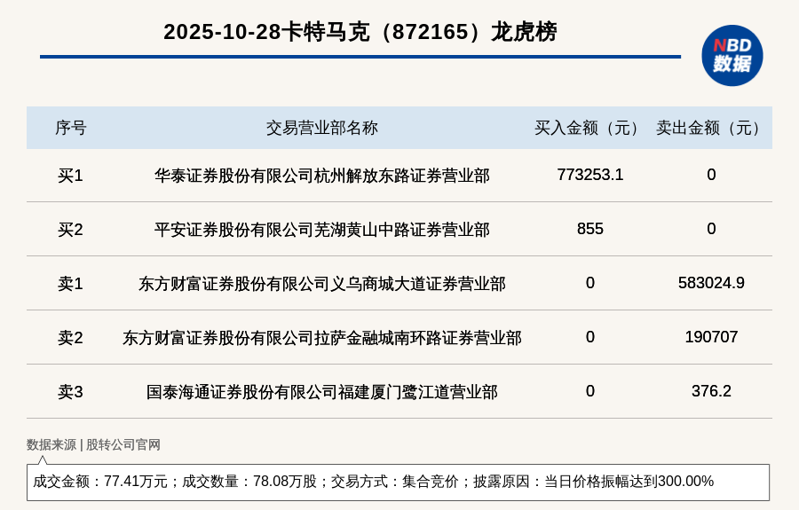 每經(jīng)訊,2025年10月28日,新三板基礎層公司卡特馬克(872165,收盤價:3.8元)登上龍虎榜,交易方式是集合競價,披露原因是當日價格振幅達到300.00%,成交數(shù)量78.08萬股,成交金額77.41萬元。買一席位為華泰證券股份有限公司杭州解放東路證券營業(yè)部,買入77.33萬元;賣一席位為東方財富證券股份有限公司義烏商城大道證券營業(yè)部,賣出58.3萬元。