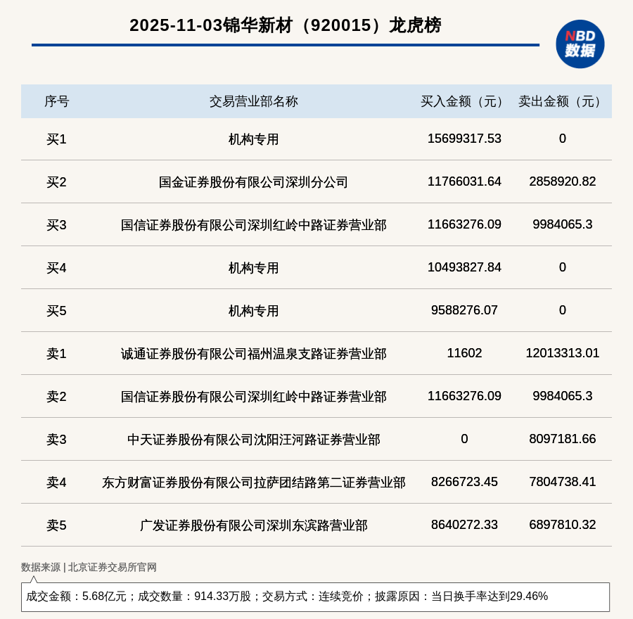 每經(jīng)訊,2025年11月3日,北交所上市公司錦華新材(920015,收盤價(jià):63.66元)登上龍虎榜,交易方式是連續(xù)競(jìng)價(jià),披露原因是當(dāng)日換手率達(dá)到29.46%,成交數(shù)量914.33萬股,成交金額5.68億元。買一席位為機(jī)構(gòu)專用,買入1569.93萬元;賣一席位為誠(chéng)通證券股份有限公司福州溫泉支路證券營(yíng)業(yè)部,賣出1201.33萬元。