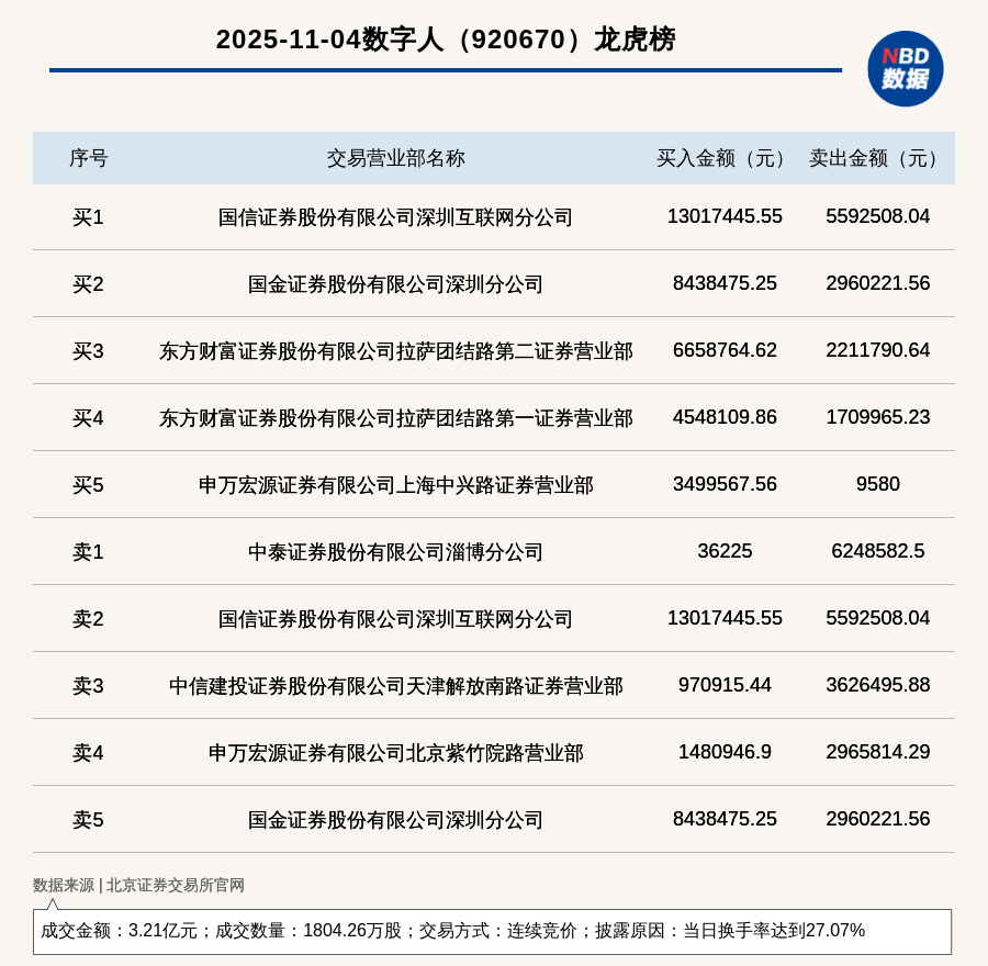 每經(jīng)訊,2025年11月4日,北交所上市公司數(shù)字人(920670,收盤價(jià):19.16元)登上龍虎榜,交易方式是連續(xù)競價(jià),披露原因是當(dāng)日換手率達(dá)到27.07%,成交數(shù)量1804.26萬股,成交金額3.21億元。買一席位為國信證券股份有限公司深圳互聯(lián)網(wǎng)分公司,買入1301.74萬元;賣一席位為中泰證券股份有限公司淄博分公司,賣出624.86萬元。