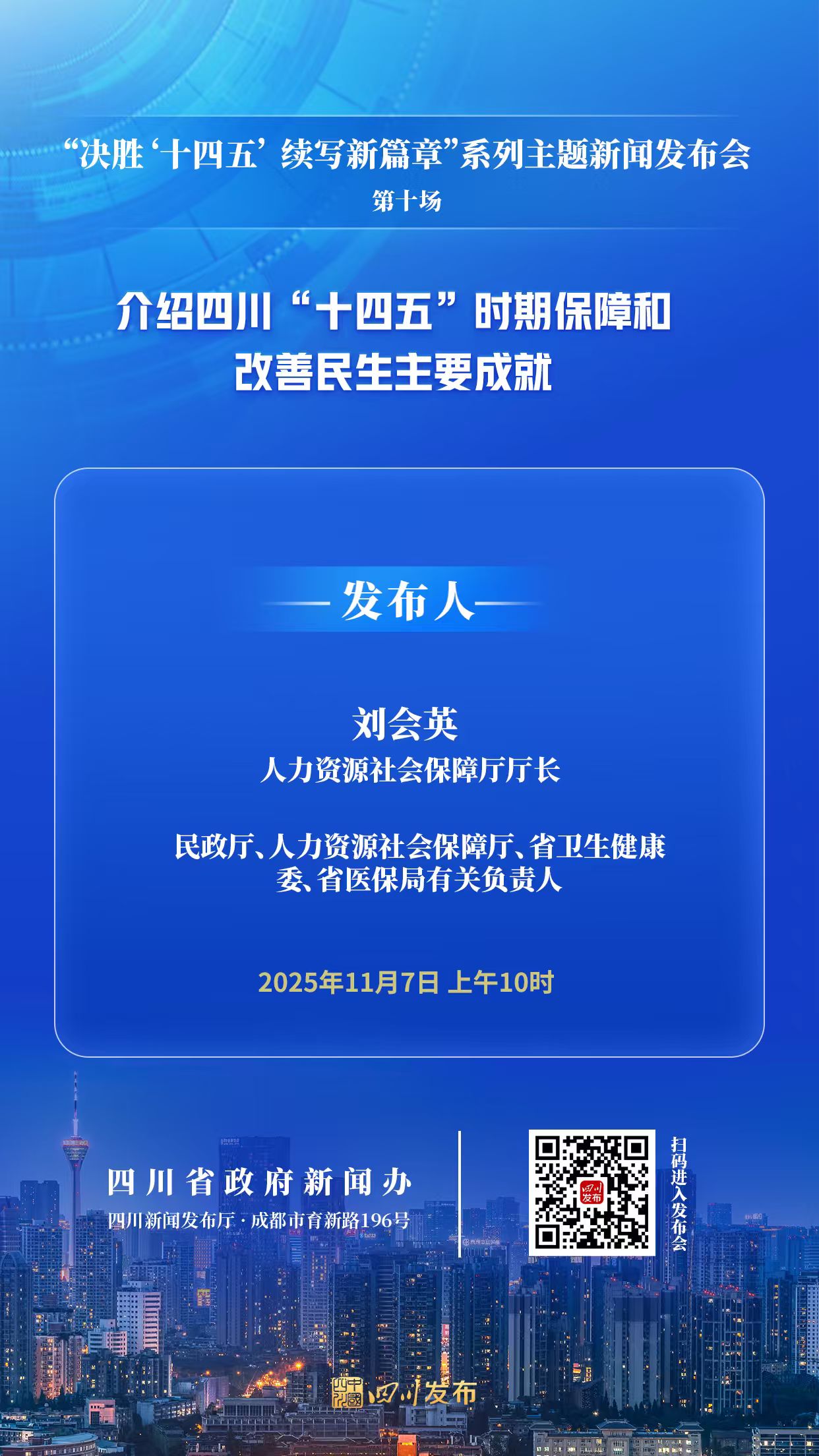2025年11月7日(星期五)10:00,省政府新聞辦將在四川新聞發(fā)布廳舉行“決勝‘十四五’ 續(xù)寫新篇章”系列主題新聞發(fā)布會第十場,人力資源社會保障廳廳長劉會英圍繞四川“十四五”時期保障和改善民生主要成就作介紹并答記者問,民政廳、人力資源社會保障廳、省衛(wèi)生健康委、省醫(yī)保局有關(guān)負(fù)責(zé)人參加答記者問。四川發(fā)布客戶端將全程圖文直播,敬請關(guān)注!