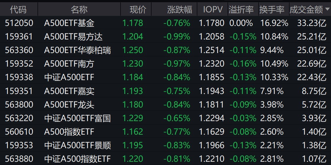 截至上午收盤(pán),場(chǎng)內(nèi)跟蹤中證A500指數(shù)的ETF小幅下跌。其中,有11只中證A500相關(guān)ETF成交額超1億元,3只超25億元。A500ETF基金、A500ETF易方達(dá)、A500ETF華泰柏瑞早盤(pán)成交額分別為33.23億元、25.21億元、25.01億元。