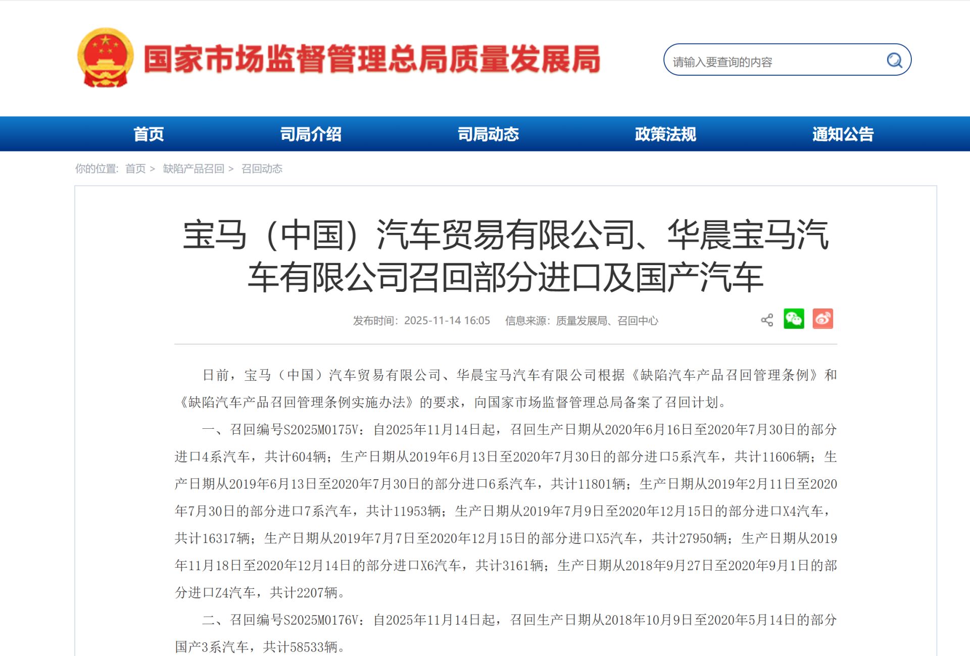 11月14日,據(jù)國家市場監(jiān)督管理總局網(wǎng)站消息,日前,寶馬(中國)汽車貿(mào)易有限公司、華晨寶馬汽車有限公司根據(jù)《缺陷汽車產(chǎn)品召回管理條例》和《缺陷汽車產(chǎn)品召回管理條例實施辦法》的要求,向國家市場監(jiān)督管理總局備案了召回計劃,自2025年11月14日起,共召回超14.4萬輛汽車。