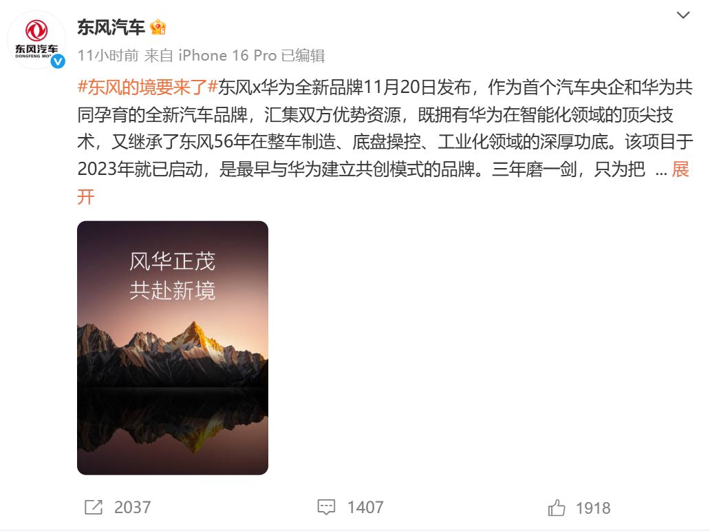 11月15日,東風(fēng)汽車宣布,與華為合作的新汽車品牌將于11月20日發(fā)布,該項(xiàng)目代號(hào)DH,定位中高端智能化車型,中文名也將揭曉。此前9月,東風(fēng)汽車董事長(zhǎng)楊青與華為創(chuàng)始人任正非、徐直軍會(huì)談,回顧合作歷程并交換意見。未來(lái),雙方將在產(chǎn)品、技術(shù)、營(yíng)銷等領(lǐng)域攜手,探索央企市場(chǎng)化運(yùn)營(yíng)新路徑,為全面協(xié)同與創(chuàng)新合作奠定基礎(chǔ)。