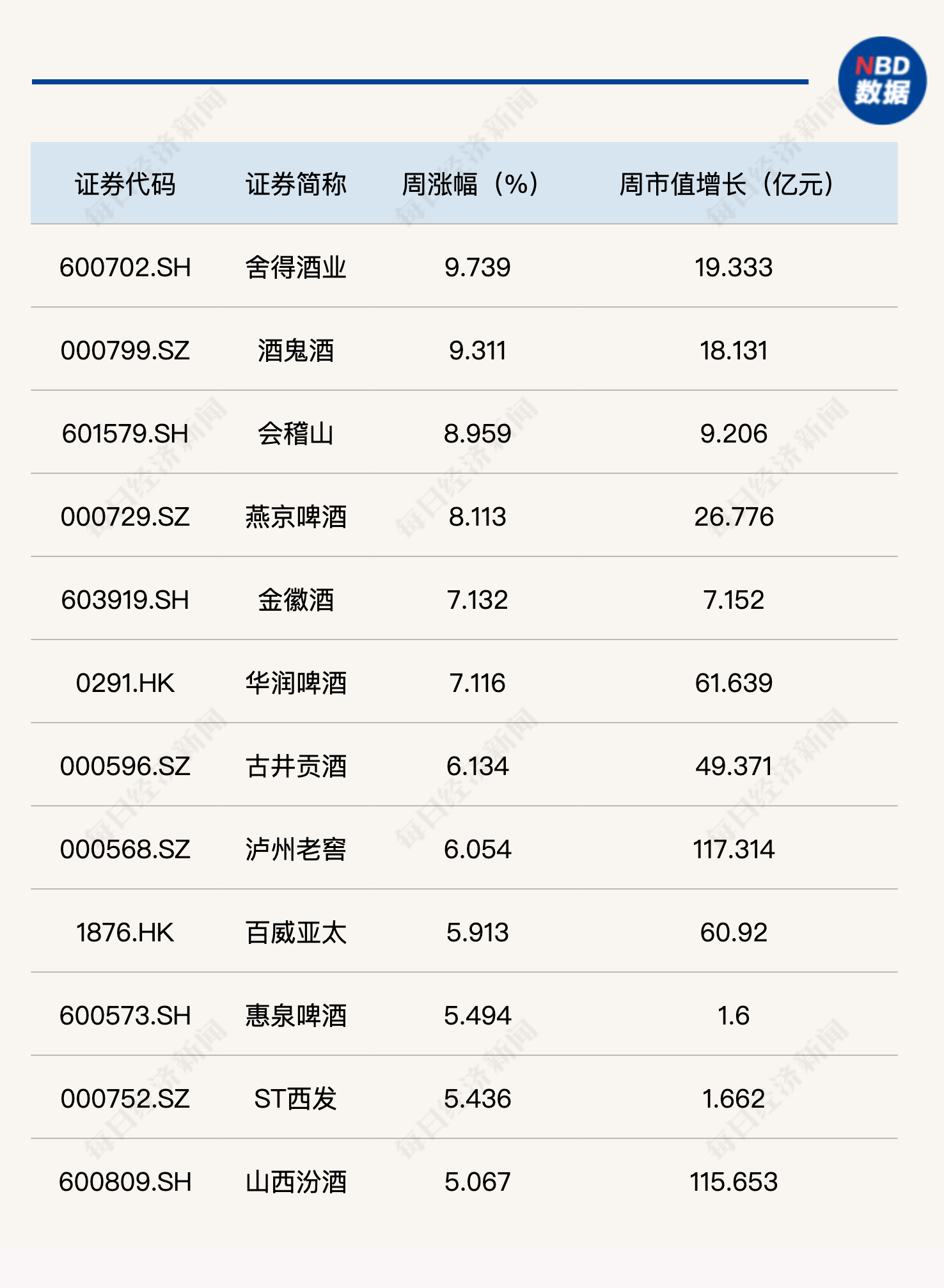 非白酒板塊方面,啤酒行業(yè)同樣反彈強(qiáng)勁,燕京啤酒、華潤(rùn)啤酒、百威亞太、惠泉啤酒以及ST西發(fā)的周漲幅均超過(guò)5%;珠江啤酒等3只啤酒股周漲幅也近5%,表現(xiàn)不俗。