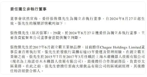 2024年8月27日,海底撈發(fā)布公告,從即日起委任29歲霸王茶姬創(chuàng)始人張俊杰為獨立非執(zhí)行董事,任期三年,年薪120萬元。