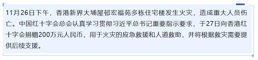 據(jù)“中國(guó)紅十字會(huì)”微信公眾號(hào)消息,昨天(11月26日)下午,香港新界大埔屋邨宏福苑多棟住宅樓發(fā)生火災(zāi),造成重大人員傷亡。中國(guó)紅十字會(huì)總會(huì)于今天向香港紅十字會(huì)捐贈(zèng)200萬(wàn)元人民幣,用于火災(zāi)的應(yīng)急救援和人道救助,并將根據(jù)救災(zāi)需要提供后續(xù)支援。