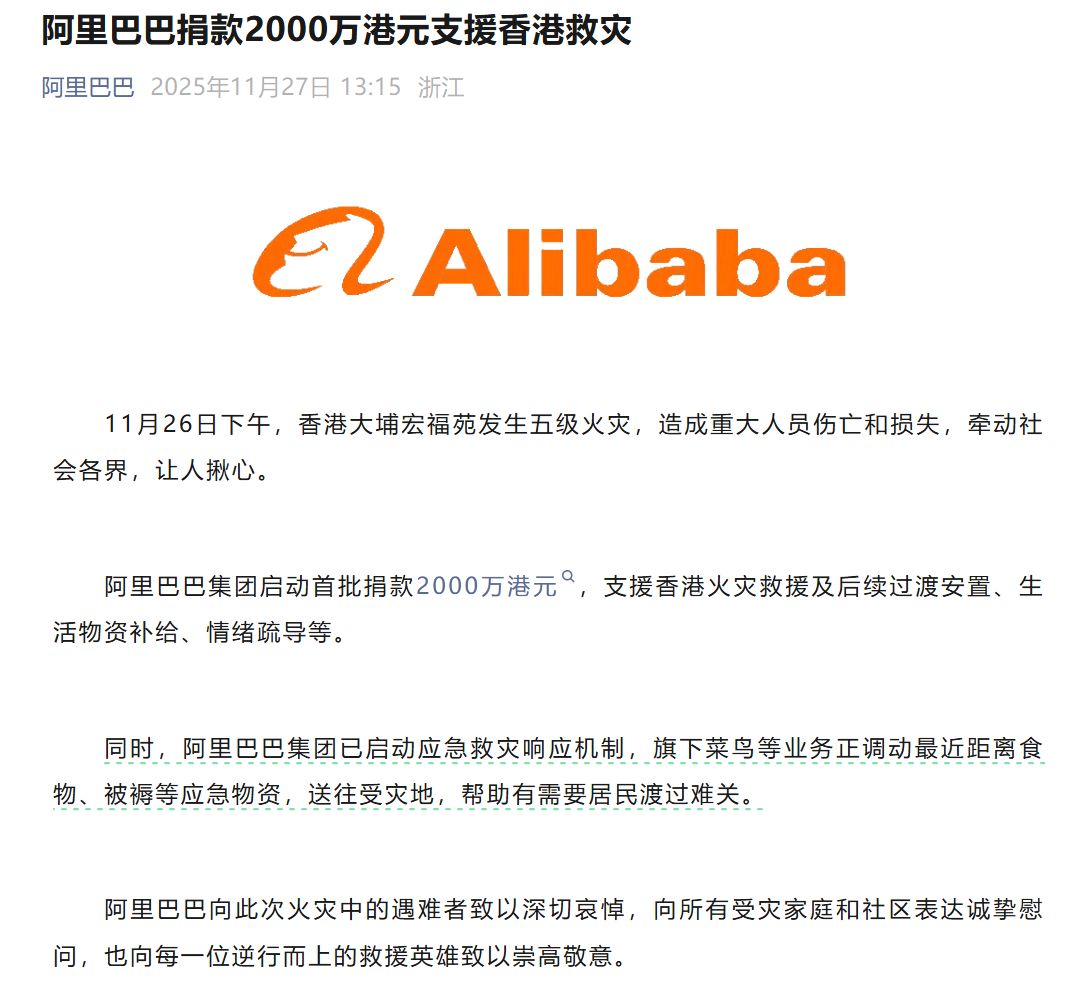 阿里巴巴集團(tuán)宣布,啟動(dòng)首批捐款2000萬(wàn)港元,支援香港火災(zāi)救援及后續(xù)過(guò)渡安置、生活物資補(bǔ)給、情緒疏導(dǎo)等。