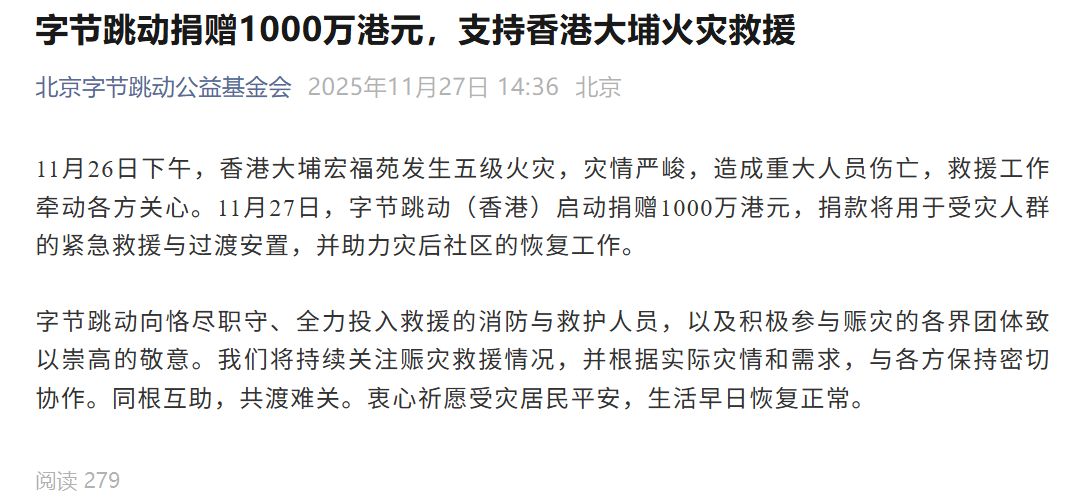 字節(jié)跳動(dòng)捐贈(zèng)1000萬(wàn)港元,支持香港大埔火災(zāi)救援,捐款將用于受災(zāi)人群的緊急救援與過(guò)渡安置,并助力災(zāi)后社區(qū)的恢復(fù)工作。