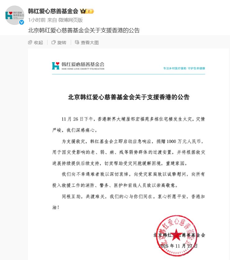 韓紅基金會(huì)捐贈(zèng)1000萬(wàn)元人民幣支援香港救災(zāi)。