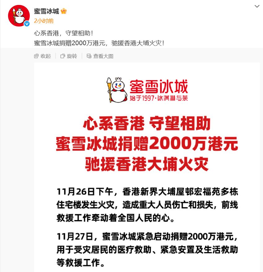 11月27日,蜜雪冰城發(fā)文稱,捐贈(zèng)2000萬(wàn)港元,馳援香港大埔火災(zāi)。