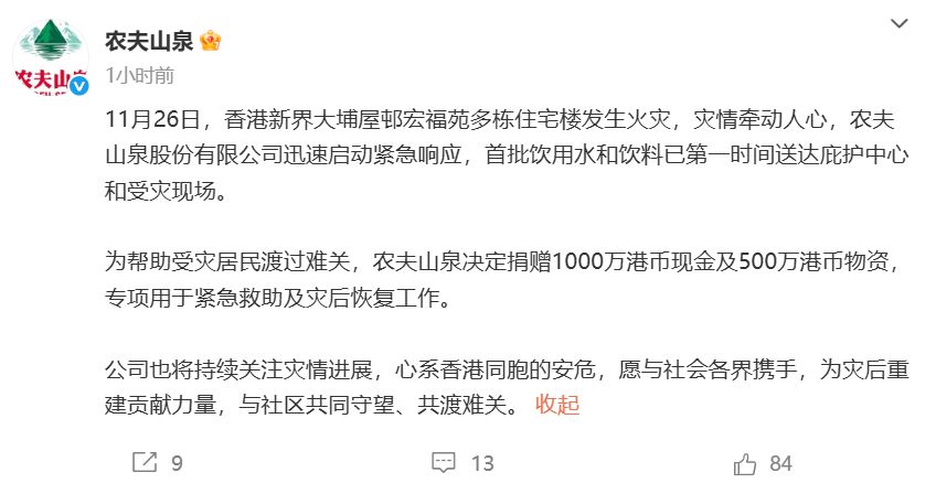 農(nóng)夫山泉稱,決定捐贈(zèng)1000萬(wàn)港幣現(xiàn)金及500萬(wàn)港幣物資,專項(xiàng)用于緊急救助及災(zāi)后恢復(fù)工作。