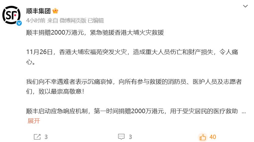 順豐集團(tuán)發(fā)文表示:順豐啟動(dòng)應(yīng)急響應(yīng)機(jī)制,第一時(shí)間捐贈(zèng)2000萬(wàn)港元,用于受災(zāi)居民的醫(yī)療救助、生活物資保障以及災(zāi)后重建。11月27日起,開(kāi)放全港146個(gè)順豐站,提供免費(fèi)救援物資運(yùn)輸服務(wù)。