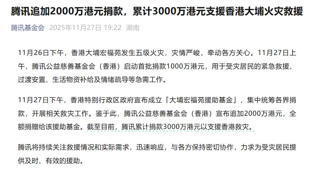 11月27日晚,騰訊基金會(huì)稱,追加2000萬(wàn)港元捐款,累計(jì)3000萬(wàn)港元支援香港大埔火災(zāi)救援。