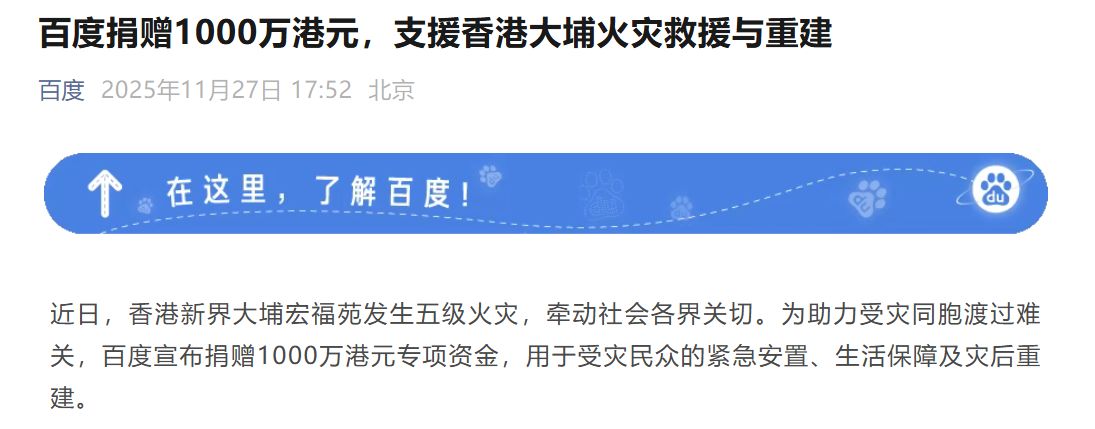 百度捐贈(zèng)1000萬(wàn)港元,支援香港大埔火災(zāi)救援與重建。