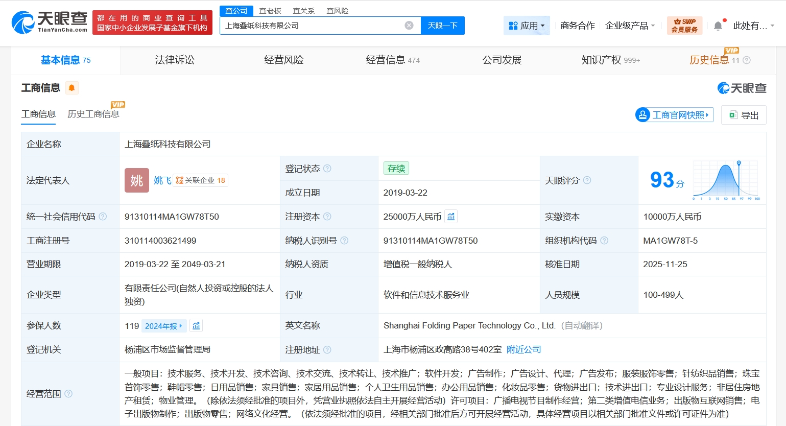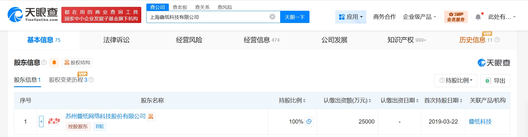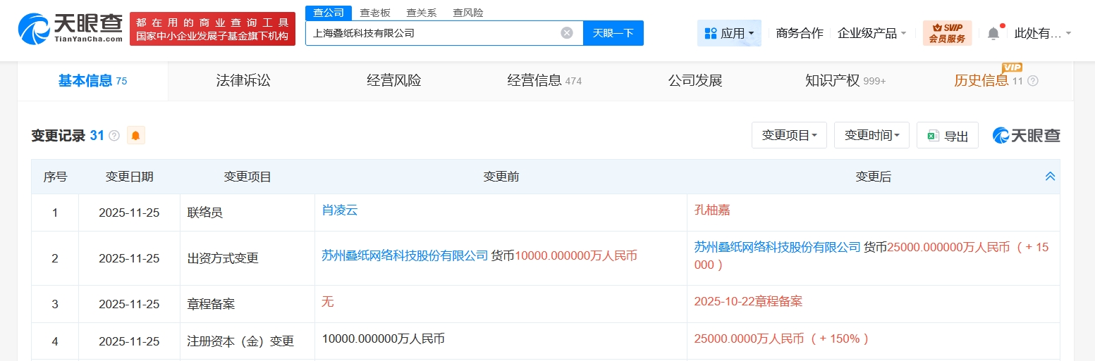 每經(jīng)AI快訊,天眼查工商信息顯示,近日,上海疊紙科技有限公司發(fā)生工商變更,注冊(cè)資本由1億元人民幣增至2.5億元人民幣,增幅150%。該公司成立于2019年3月,經(jīng)營(yíng)范圍含軟件開(kāi)發(fā)、廣告制作、服裝服飾零售、針紡織品銷售、珠寶首飾零售、鞋帽零售、日用品銷售、廣播電視節(jié)目制作經(jīng)營(yíng)、網(wǎng)絡(luò)文化經(jīng)營(yíng)等。股東信息顯示,該公司由蘇州疊紙網(wǎng)絡(luò)科技股份有限公司全資持股。