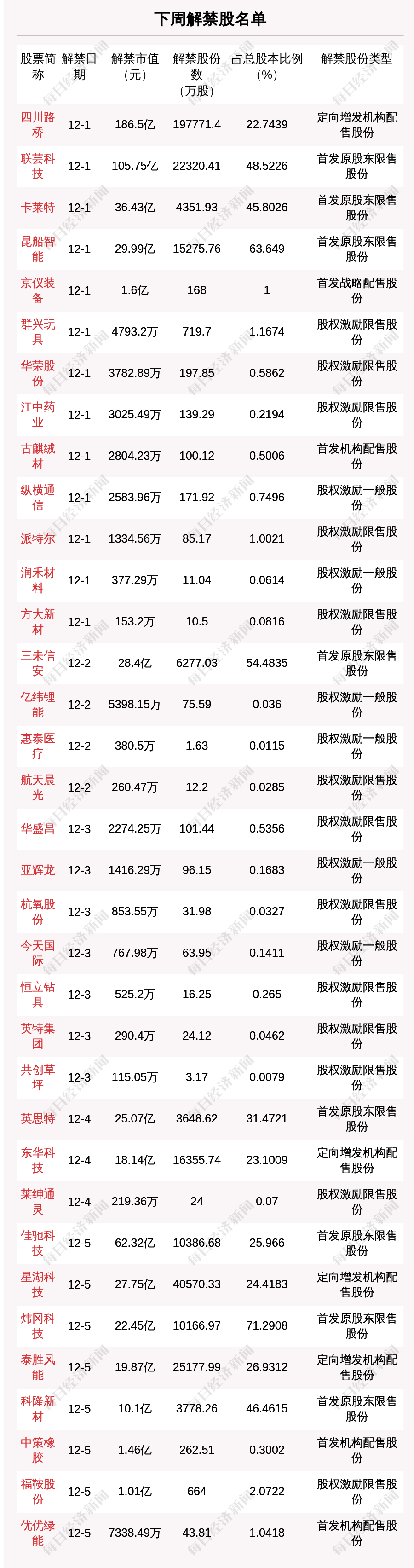 具體到個(gè)股,下周解禁市值排名前3的是四川路橋、聯(lián)蕓科技、佳馳科技,解禁市值分別為186.5億元、105.75億元、62.32億元。