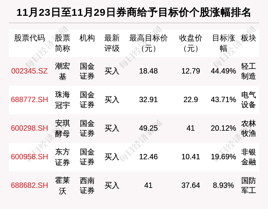 每經(jīng)AI快訊,11月23日至11月29日,券商給予評(píng)級(jí)的個(gè)股數(shù)共有80只,獲得買入評(píng)級(jí)的個(gè)股數(shù)共有51只。在公布了目標(biāo)價(jià)格的5只個(gè)股中,按照最新收盤價(jià)計(jì)算,預(yù)期漲幅排名居前的個(gè)股是潮宏基(002345.SZ)、珠海冠宇(688772.SH)、安琪酵母(600298.SH),預(yù)期漲幅分別是44.49%、43.71%、20.12%。