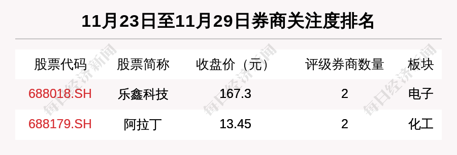 從券商對(duì)個(gè)股的關(guān)注程度來(lái)看,有2只個(gè)股獲得多家券商關(guān)注,券商關(guān)注數(shù)量排名居前的個(gè)股是樂(lè)鑫科技(688018.SH)、阿拉?。?88179.SH)。