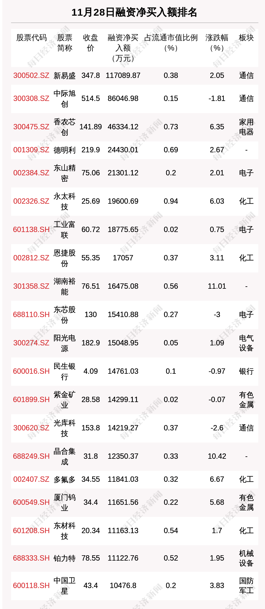 從融資資金凈買入金額來看,共有20只個股凈買入金額超億元,其中新易盛、中際旭創(chuàng)、香農(nóng)芯創(chuàng)排名前三,買入金額分別為11.71億元、8.6億元、4.63億元。