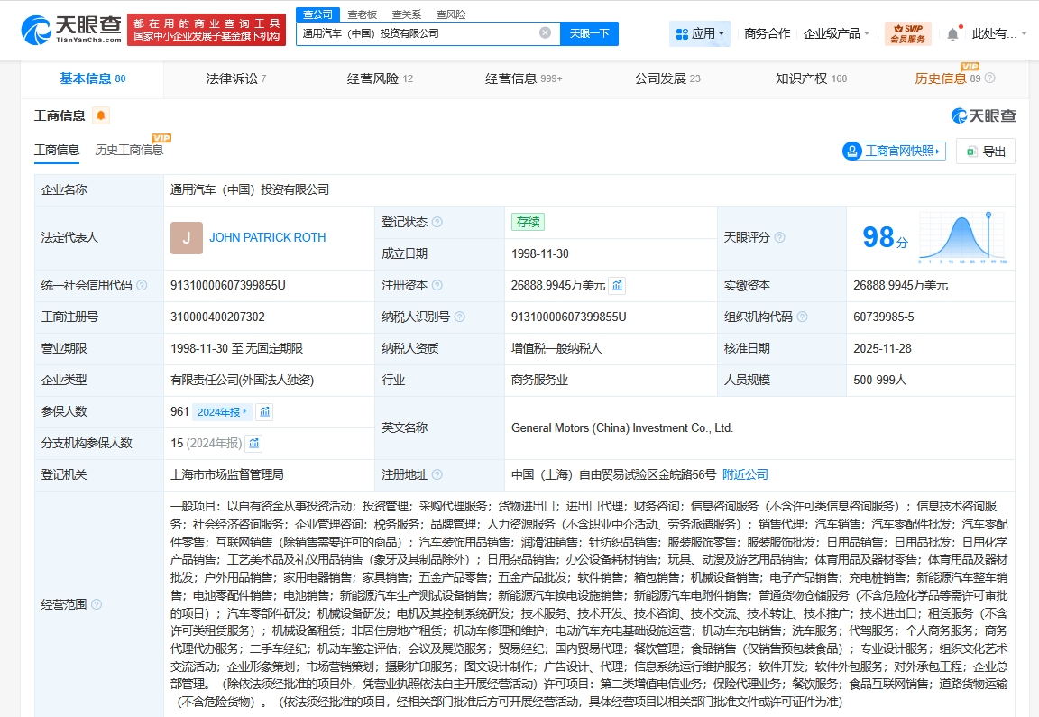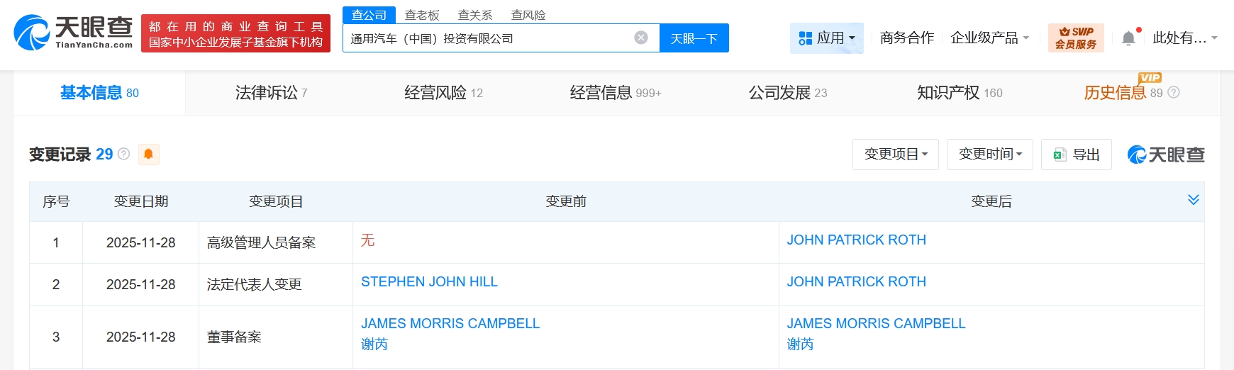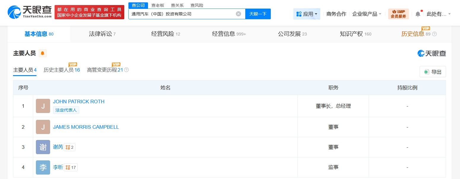 每經(jīng)AI快訊,天眼查App顯示,近日,通用汽車(中國)投資有限公司發(fā)生工商變更,STEPHENJOHNHILL卸任法定代表人、董事長兼總經(jīng)理,由JOHNPATRICKROTH接任。該公司成立于1998年11月,注冊資本約2.7億美元,經(jīng)營范圍含以自有資金從事投資活動、投資管理、采購代理服務(wù)、貨物進出口、進出口代理、財務(wù)咨詢、信息咨詢服務(wù)等。股東信息顯示,該公司由通用汽車中國有限責任公司全資持股。