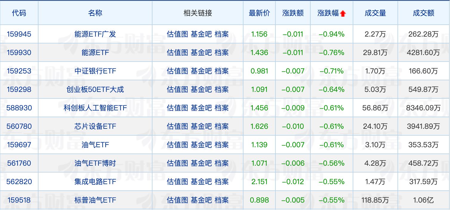 下跌方面,能源相關(guān)ETF回調(diào)居前,但跌幅均在1%以內(nèi)。