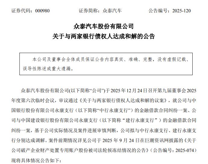 12月24日晚間,眾泰汽車(000980.SZ)發(fā)布公告稱,公司第九屆董事會2025年度第六次臨時會議通過與中國銀行股份有限公司永康支行(以下簡稱中行永康支行)、中國建設(shè)銀行股份有限公司永康支行(以下簡稱建行永康支行)達(dá)成和解的議案。