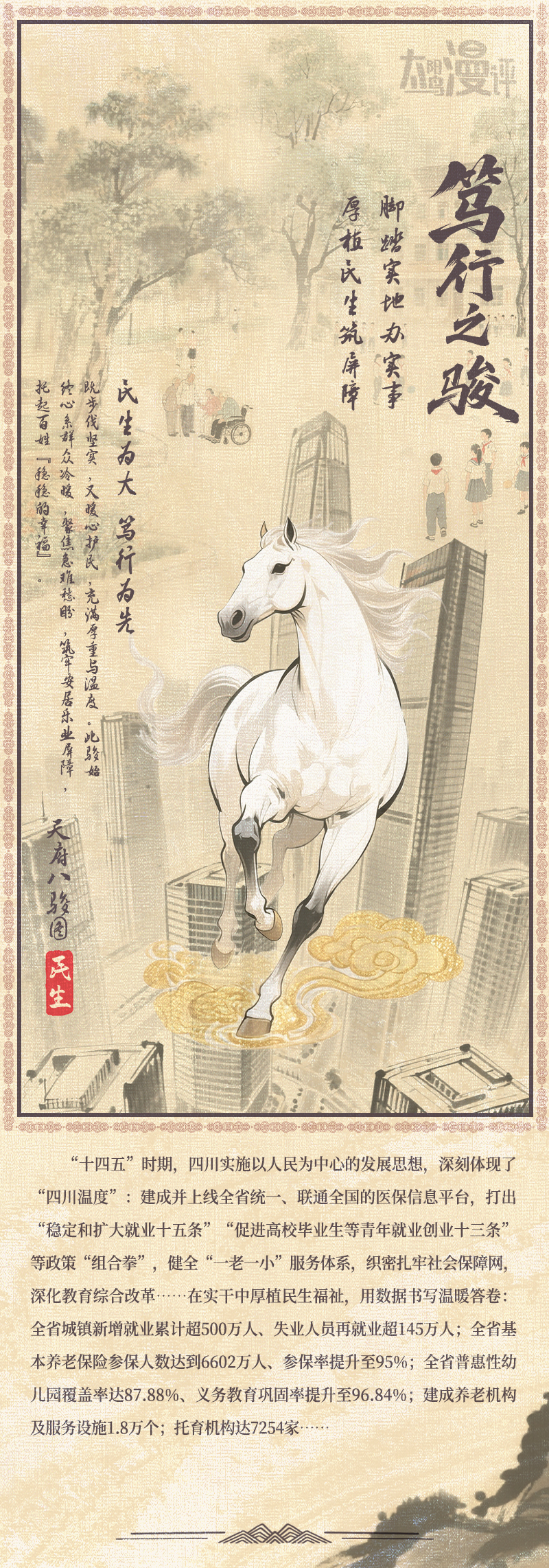 “十四五”時期,四川實施以人民為中心的發(fā)展思想,深刻體現(xiàn)了“四川溫度”:建成并上線全省統(tǒng)一、聯(lián)通全國的醫(yī)保信息平臺,打出“穩(wěn)定和擴(kuò)大就業(yè)十五條”“促進(jìn)高校畢業(yè)生等青年就業(yè)創(chuàng)業(yè)十三條”等政策“組合拳”,健全“一老一小”服務(wù)體系,織密扎牢社會保障網(wǎng),深化教育綜合改革……在實干中厚植民生福祉,用數(shù)據(jù)書寫溫暖答卷:全省城鎮(zhèn)新增就業(yè)累計超500萬人、失業(yè)人員再就業(yè)超145萬人;全省基本養(yǎng)老保險參保人數(shù)達(dá)到6602萬人、參保率提升至95%;全省普惠性幼兒園覆蓋率達(dá)87.88%、義務(wù)教育鞏固率提升至96.84%;建成養(yǎng)老機(jī)構(gòu)及服務(wù)設(shè)施1.8萬個;托育機(jī)構(gòu)達(dá)7254家……