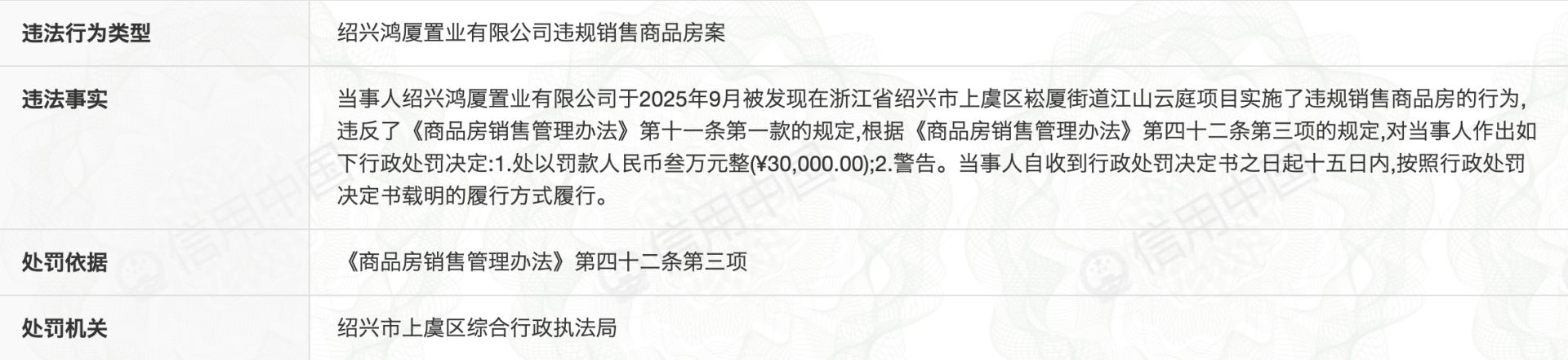 根據(jù)信用中國(guó)官網(wǎng),12月22日,紹興市上虞區(qū)綜合行政執(zhí)法局對(duì)紹興鴻廈置業(yè)有限公司進(jìn)行警告并處以3萬(wàn)元罰款,違法行為是違規(guī)銷(xiāo)售商品房案。