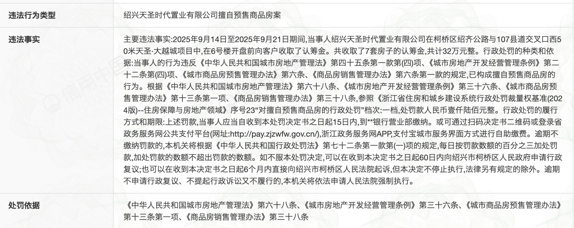 除了江山云庭,信用中國(guó)官網(wǎng)在12月17日還披露了紹興天圣時(shí)代置業(yè)有限公司的一則行政處罰決定書(shū)。