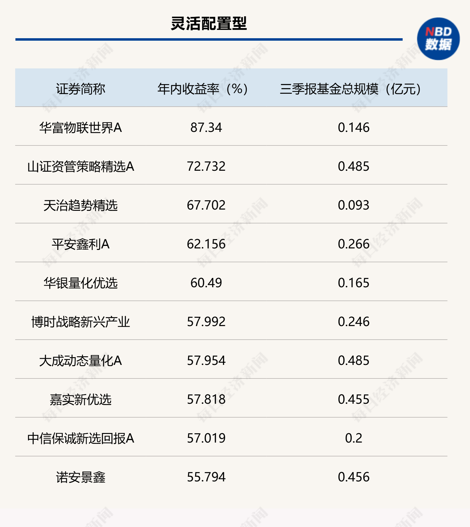 靈活配置型基金中,有226只總規(guī)模在三季度末低于5000萬元(統(tǒng)計初始基金)。截至12月29日,這些基金當中有27只年內凈值增長率超過40%,另有11只超過50%,業(yè)績最好的是華富物聯(lián)世界A,年內收益率達到87.34%,三季度末規(guī)模合計為0.15億元。