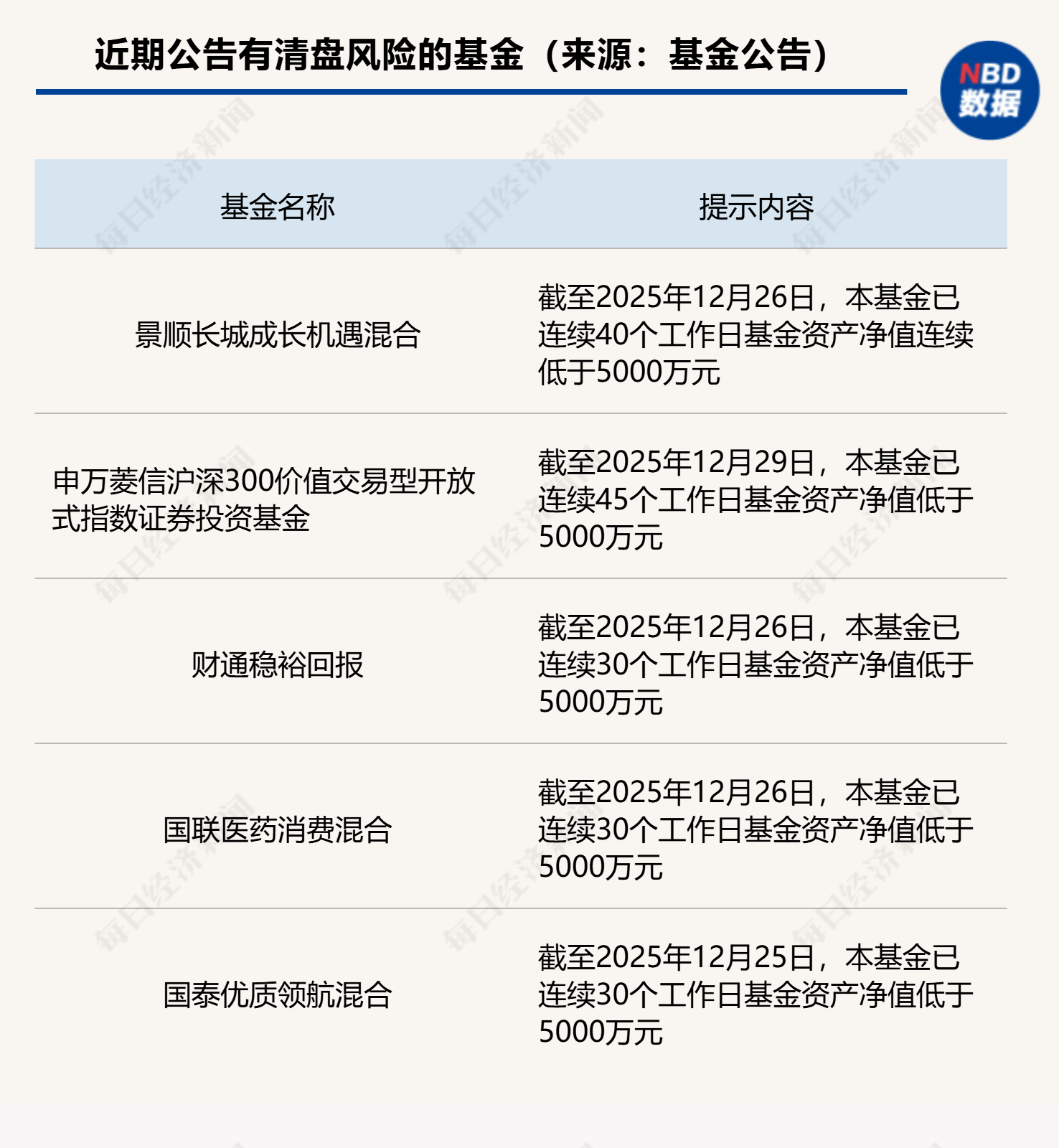 12月30日,景順長城、華商、建信等基金公司發(fā)布公告稱,旗下有基金資產凈值連續(xù)低于5000萬元,提示投資人注意風險。一般來說,基金資產凈值連續(xù)50個工作日低于5000萬元的,將直接清盤。