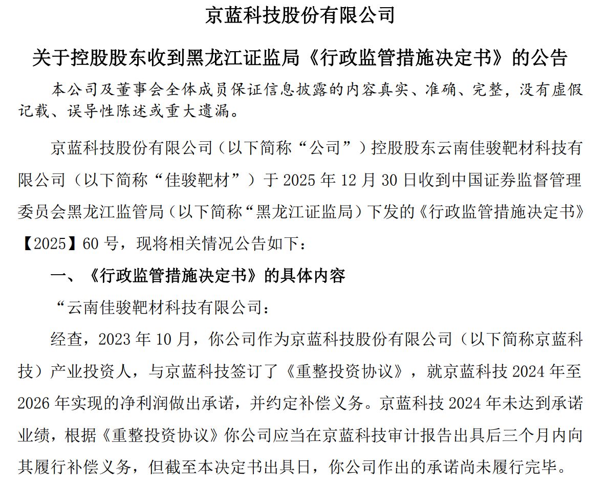 12月30日,深圳證券交易所(以下簡稱“深交所”)與中國證券監(jiān)督管理委員會黑龍江監(jiān)管局(以下簡稱“黑龍江證監(jiān)局”)接連發(fā)聲,將監(jiān)管的“聚光燈”直指ST京藍(即京藍科技,SZ000711,股價1.74元,市值49.71億元)控股股東云南佳駿靶材科技有限公司(以下簡稱“云南佳駿”)。