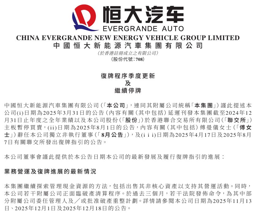 12月31日,恒大汽車(chē)在港交所稱,集團(tuán)繼續(xù)探索管理現(xiàn)金資源的方法,包括出售其非核心資產(chǎn)以支持其營(yíng)運(yùn)活動(dòng)。同時(shí),公司若干附屬公司正面臨破產(chǎn)清算程序。于過(guò)去三個(gè)月,若干法院發(fā)布命令,為其中部分附屬公司委任管理人及/或批準(zhǔn)破產(chǎn)重整計(jì)劃。