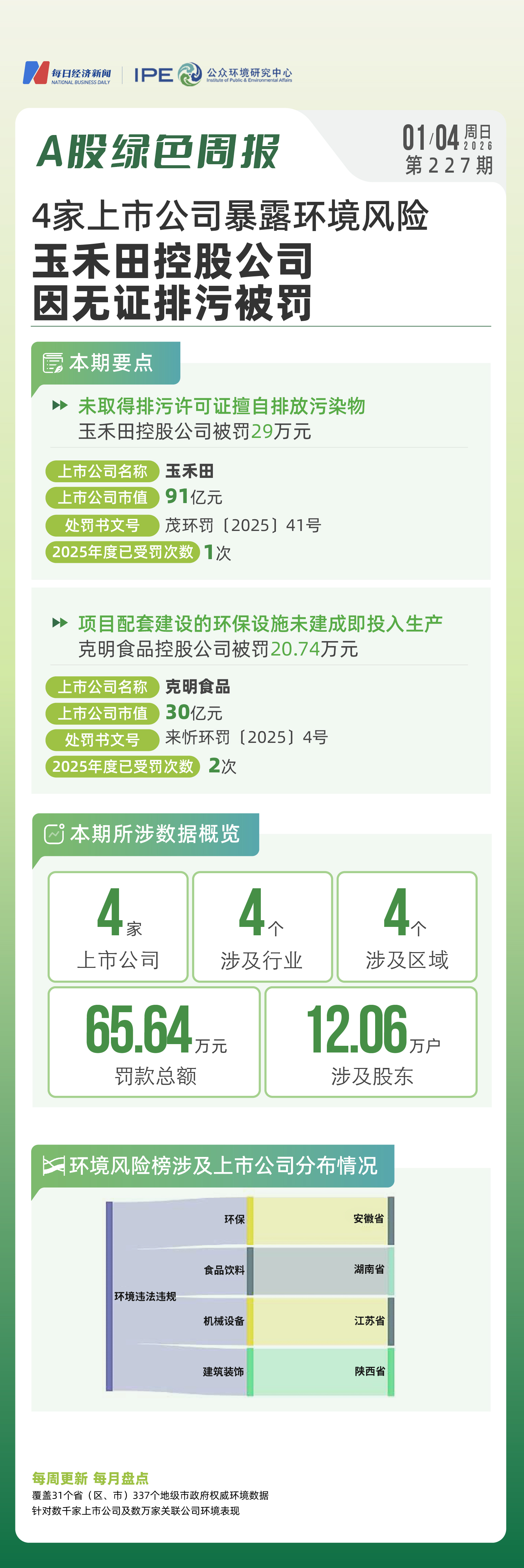 《每日經(jīng)濟(jì)新聞》聯(lián)合公眾環(huán)境研究中心自2020年9月起發(fā)布“A股綠色周報(bào)”。2026年1月第一周數(shù)據(jù)顯示,4家上市公司暴露環(huán)境風(fēng)險(xiǎn),涉及12.06萬戶股東。其中,玉禾田控股公司因無證排污被罰29萬元,新銳股份控股公司因違反危險(xiǎn)廢物防治規(guī)定被罰10.9萬元,克明食品控股公司因環(huán)保設(shè)施未建先投被罰20.74萬元。
