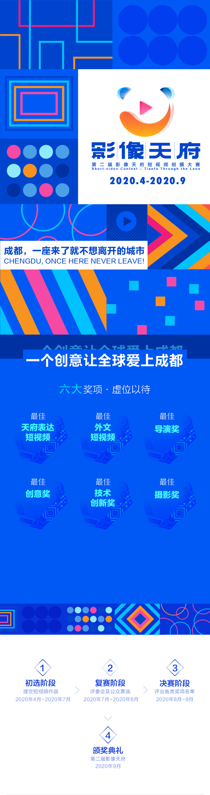 “第二屆影像天府·短視頻創(chuàng)攝大賽”于2020年4月正式啟動(dòng),邀約全球創(chuàng)攝愛好者續(xù)寫“成都,一座來了就不想離開的城市”篇章,征集優(yōu)質(zhì)影像作品。本次大賽設(shè)置最佳天府表達(dá)短視頻、最佳外文短視頻、最佳導(dǎo)演獎(jiǎng)、最佳創(chuàng)意獎(jiǎng)、最佳技術(shù)創(chuàng)新獎(jiǎng)、最佳攝影獎(jiǎng)六大專業(yè)。評(píng)委包括中國(guó)電影家協(xié)會(huì)副主席,上海電影家協(xié)會(huì)主席任仲倫;艾美獎(jiǎng)得主,美國(guó)著名影視導(dǎo)演、制片人Mark